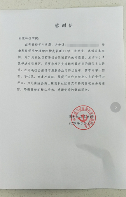 感谢信称,在全面阻击新冠肺炎疫情蔓延的特殊时期,黄蓉同学自愿加入志愿者的队伍。寒假在家期间,她听到社区在招募抗击新冠肺炎的志愿者,主动写了请愿书递交到社区,并要求社区安排她到最艰苦的岗位上去锻炼。在开展抗击疫情志愿服务活动的过程中,黄蓉同学不怕苦,不怕累,事事冲在前,展现了当代大学生应有的责任与担当。为此南陵县籍山镇逸和社区党支部特向所在学校发来感谢信,感谢学校的精心培养,感谢优秀的黄蓉同学。