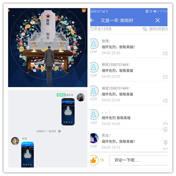 众多师生在平台上纷纷向为人民利益、国家发展而牺牲的烈士“扫墓、鞠躬、献花、敬酒”。师生们感触颇深,在活动下方留言,学生们纷纷表示:要缅怀先烈,铭记英雄。老师们表示:要继承先烈遗志、弘扬优秀传统,忆苦思甜,勤奋努力学习,希望大学生争做“三有青年”。农学(对口)192班张芬留言:“感谢为我们负重前行最可爱的人,你们没有离开,只是换个地方,活在我们心中。今生无悔入华夏,来世还做中国人”。农学192班姚中豪留言:“为了祖国的安定强盛,为了世界的和平,我们要珍惜现在的每一天,好好学习,好好锻炼,长大以后也要像英雄、先烈那样报效我们的祖国”。