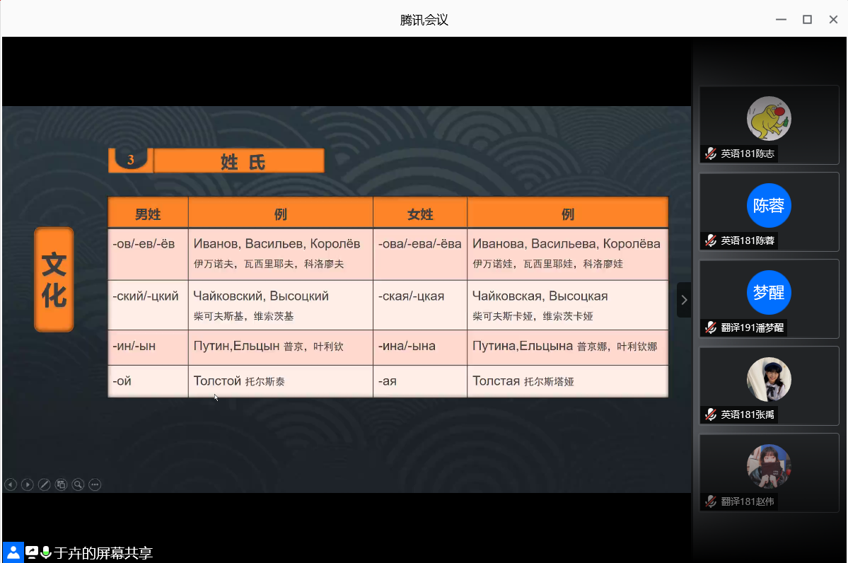 为进一步丰富外国语学院学生校园文化生活,拓宽学生对俄罗斯文化的了解和认识,领略俄罗斯的风情,外国语学院于6月17日晚上,利用腾讯会议,举行“英博杯”安徽科技学院第十一届外语文化节之俄罗斯风情讲座。本次讲座邀请校教务处于卉老师担任主讲人,外国语学院18、19级全体学生参加,外国语学院专职辅导员宋兵兵老师主持本次讲座。