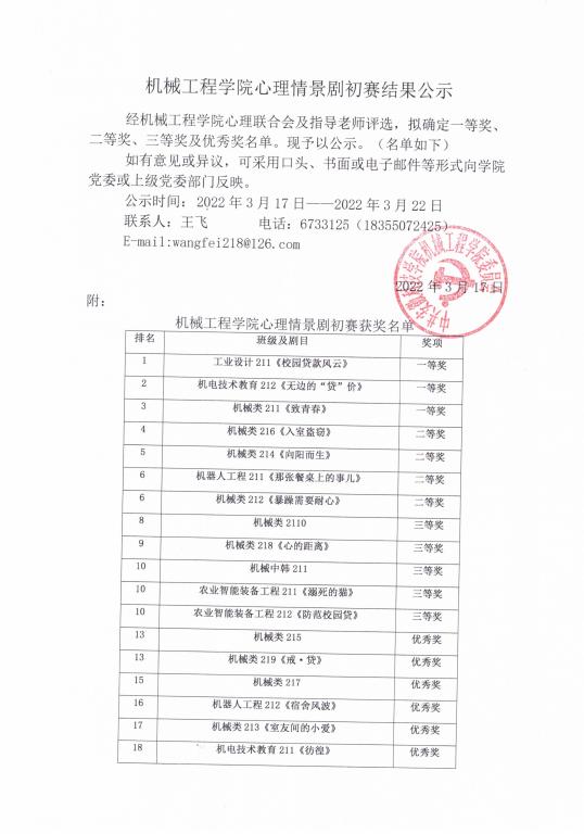 本次心理情景剧大赛获得一等奖的班级是工业设计211班、机电技术教育212、机械类211;获得二等奖的班级是机械类216、机械类214、机器人工程211、机械类212;获得三等奖的班级是机械类2110、机械类218、机械中韩211、农业智能装备工程211、农业智能装备工程211,其他参赛班级获得优秀奖。