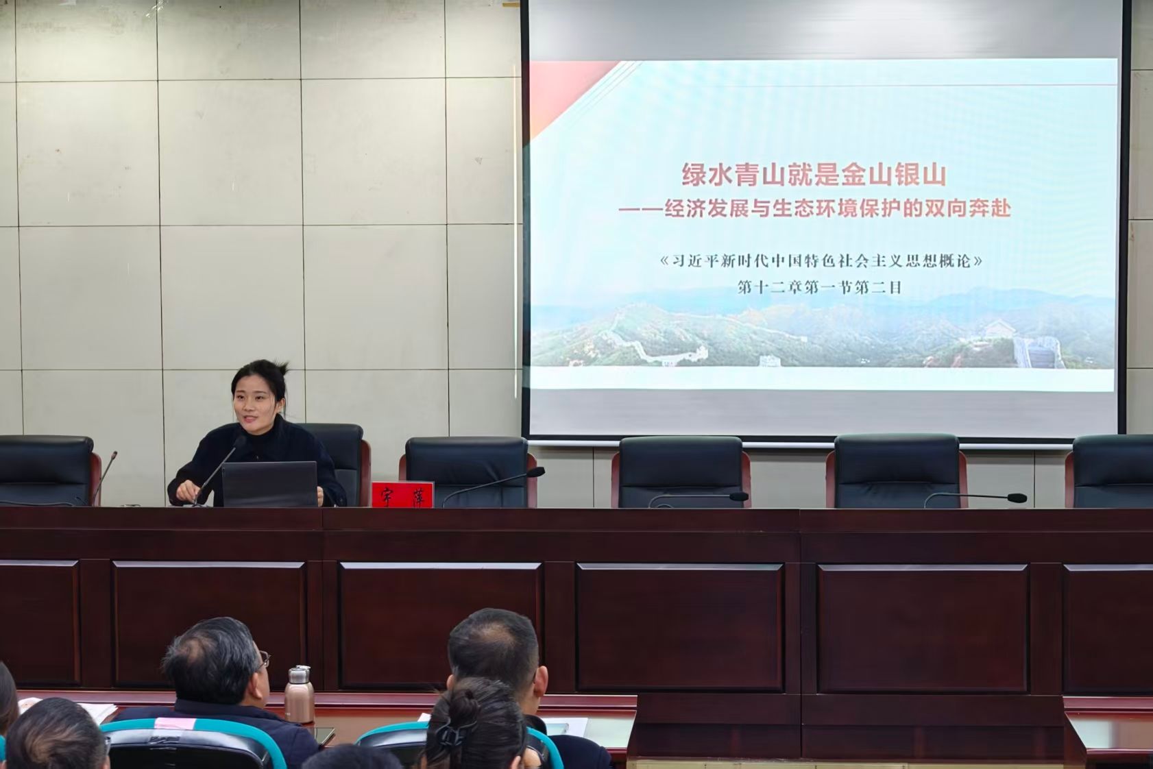 为凸显“循序渐进、螺旋上升”的一体化育人理念,研修特设置“跨学段・同主题”教学展示环节。围绕“建设社会主义生态文明”主题,小学、初中、高中、大学四个学段的教师代表通过说课、无生授课等形式,呈现了梯度化的教学设计与学段衔接逻辑。马克思主义学院教师宇萍以“绿水青山就是金山银山”为题开展高校学段教学展示,从理论高度系统解读习近平生态文明思想,为中小学教学提供了理论支撑与方向指引,形成了“启蒙认知—责任培养—法治护航—理论升华”的完整育人链条,为参训教师提供了可复制、可推广的实践范例。