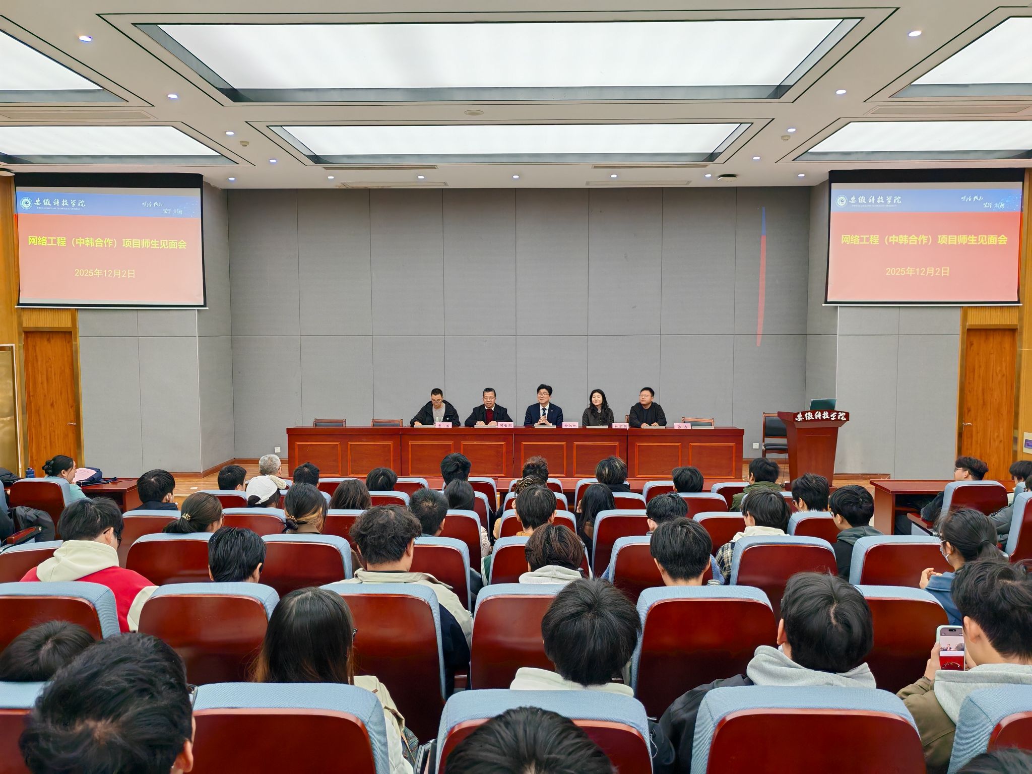 会后,曹浩主持召开了中韩班师生见面会。顺天乡大学国际教育交流处副主任林丽明介绍了该校基本情况,并就留学政策进行了宣讲,柳炳旭和何世潮分别发言,鼓励学生充分认识项目优势,抓住机会,开阔国际视野,强化专业学习,磨炼心智能力,全方位成长成才。