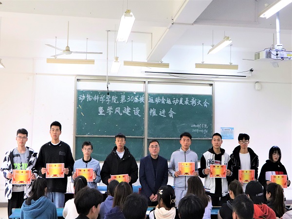 李焱宣读《关于给予参加安徽科技学院第三十届田径运动会学生运动员通报表扬的决定》,胡文丽宣读获得校第30届田径运动会动物科学学院优秀运动员学生名单,动医192班赵虎代表运动员发言。大会集中表彰了动物科学学院在学校第三十届田径运动会取得佳绩的学生运动员。(特约通讯员:胡文丽 摄影:毕溢文 审核:汤帅 编辑:张威)