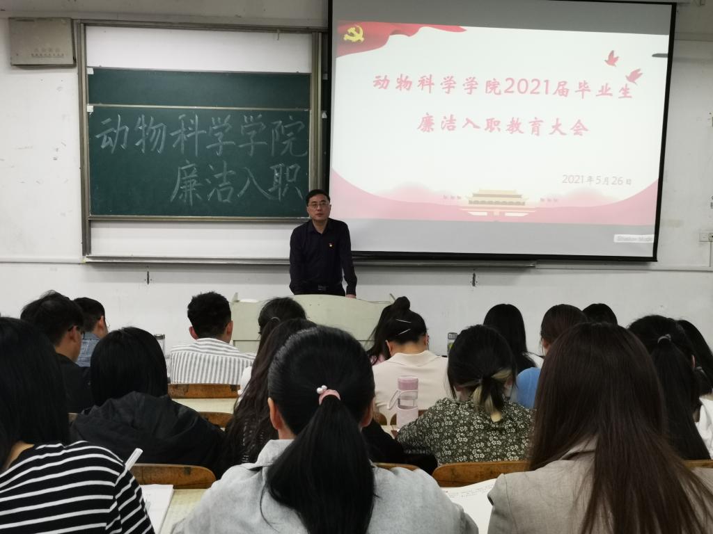 为加强毕业生党员的党性修养,增强毕业生党员的廉洁自律意识, 5月26日上午,动物科学学院在求知楼A102召开2021届毕业生党员廉洁入职教育大会。动物科学学院党委书记姚勇,党委副书记汤帅,党政办主任、团委书记李焱,辅导员胡文丽及2021届全体毕业生党员参加会议,会议由汤帅主持。