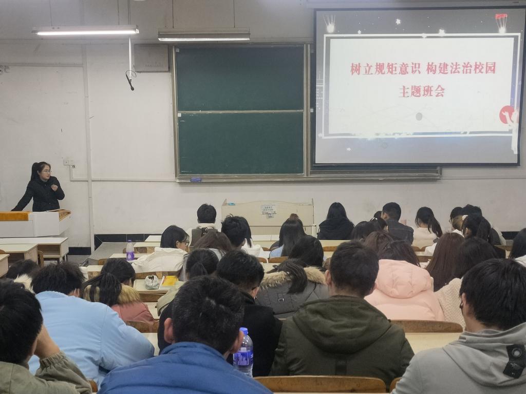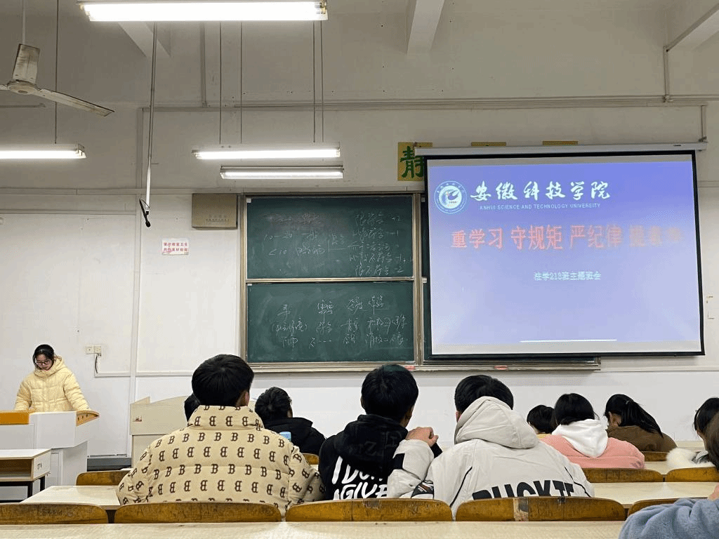 各班级通过主题班会还学习了《安徽科技学院学生违纪处分办法》《安徽科技学院学生日常行为规范》《安徽科技学院学生住宿管理规定》等校规校纪。