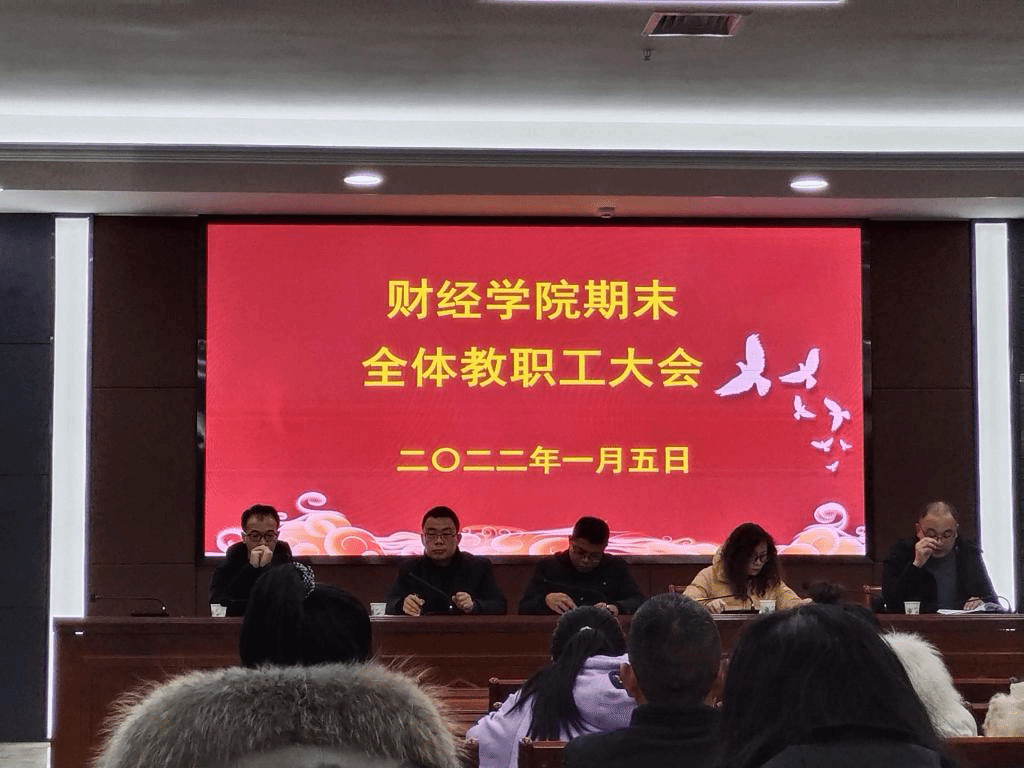 1月5日,财经学院在龙湖校区西辅楼111会议室召开全体教职工会议,部署本学期末及下学期开学初工作,明确2022年工作重点和努力方向。学院党政领导及全体教职工参加会议,会议由学院党委副书记、纪委书记耿广汉主持。