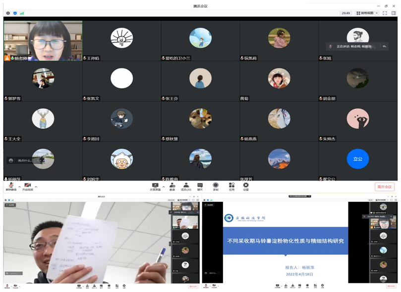 本次学术交流利用业余时间以教师引导、重点科研示范报告、学生汇报分享的“师生共建”方式线上开展,形式灵活,师生参与感强,气氛宽松,参会的师生们都表示受益匪浅,特别是研究生都受到了很大的启发,认识到现阶段的学习和积累是为今后的发展奠定扎实的基础。食品营养与安全系教工党支部坚持党建引领发展,把党建融入教学科研等业务工作,有利于推动学院中心工作,也进一步提高了党支部的凝聚力和向心力。(特约通讯员:杨勇 审核:付光玺 编辑:张威)