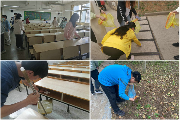 劳动教育主题实践活动中,学员们各自准备手套、垃圾袋、扫帚等清洁工具,在指导老师或各组组长的带领下有序开展。有的小组来到学院劳动实践区,或戴手套清理落叶,或清扫路面的树叶树枝,或用夹子清理草地中的纸片垃圾,或用铲子清除墙体牛皮癣,或将路边的车辆摆放整齐。