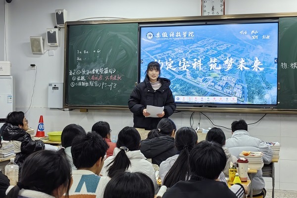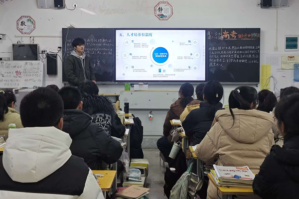 近日,动物科学学院动物医学221班余惠真、徐浮、王志杰三位同学组成团队,来到东至县第二中学,开展了一场鼓舞士气的宣传交流活动。本次活动不仅为学弟学妹们带来了最新的高校资讯,更通过分享自身经历,激励着学弟学妹们为梦想努力拼搏。