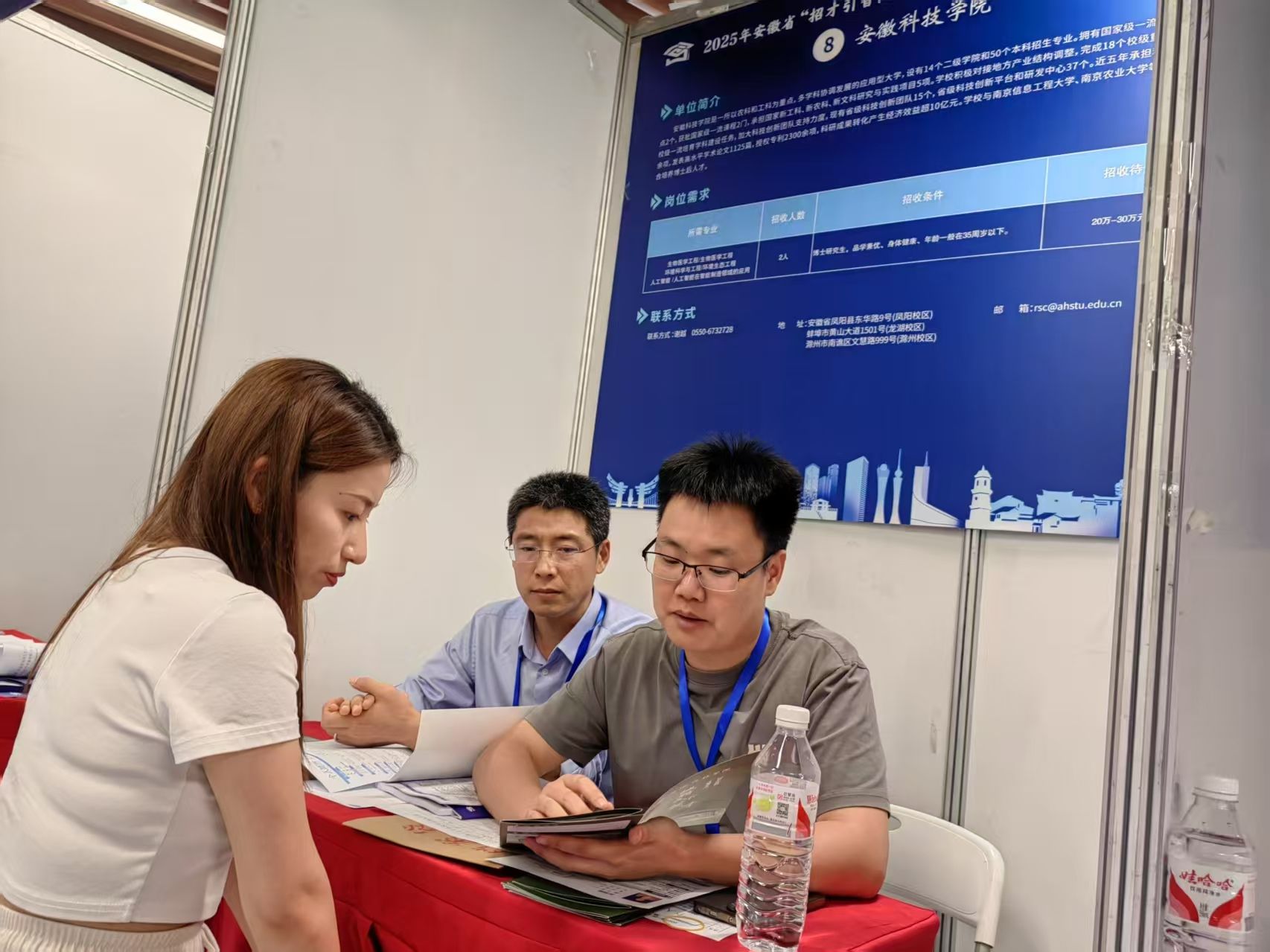 招聘会现场气氛热烈,我校展位前人头攒动,吸引了众多求职者驻足咨询。我校教师代表向应聘者详细介绍我校优越的办学条件、强劲的发展势头、富有竞争力的引才政策;耐心解答应聘者关于学科方向、科研团队、工作环境、职业发展等方面的具体问题,全面展示了我校爱才、惜才、重才的良好氛围。不少优秀人才表达了加盟安徽科技学院的强烈意愿,提交了个人简历,部分人员初步达成来校考察意向。