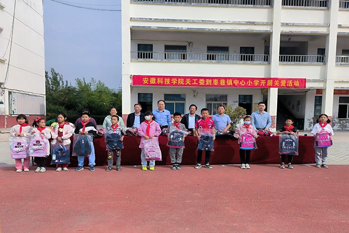 9月23日,安徽科技学院关工委一行5人,在关工委副主任杨秀军及离退休工作处处长、关工委秘书长时乾带领下,前往凤阳县枣巷镇中心小学开展乡村振兴、关工助学活动。