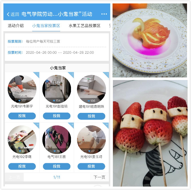 根据电气与电子工程学院《关于举办第一届“劳动教育”主题月系列活动的通知》(电党字〔2020〕9号)文件要求,继上次举办的社会劳动之后,4月18日至28日,学院组织学生参加一次家庭劳动。本次活动主要分两部分进行,包括“小鬼当家”和“水果工艺品大赛”。活动的宣传和评选在易班进行。