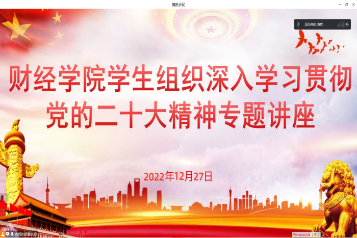 为深入学习宣传贯彻党的二十大精神,财经学院于2022年12月27日通过腾讯会议开展深入学习贯彻党的二十大精神理论宣讲。财经学院学生会、社联、心联、易班工作站等学生组织共80余名学生干部参加。学院专职辅导员尹成超主讲。