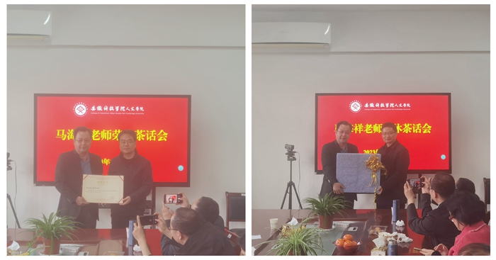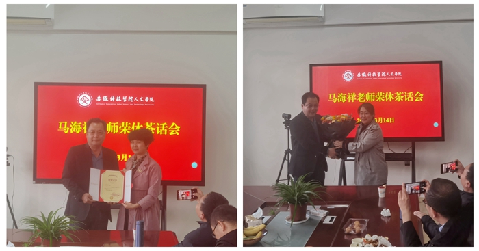 杜士凤代表学院全体师生向马海祥老师表示衷心感谢,高度评价他工作认真负责、乐于奉献、为人谦和、乐于助人的优良品格,赞扬他为学院全体教师树立了榜样,希望合理安排好自己退休生活的同时,关心和支持学院的工作,为学院发展多提宝贵意见建议,为青年教师的进步提供指导。