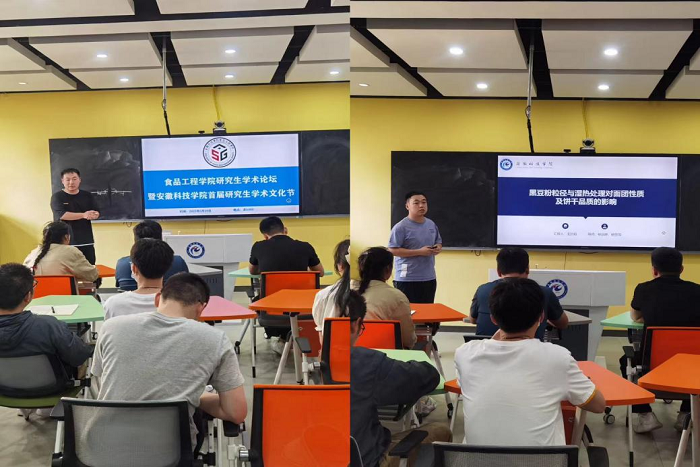 报告会邀请了优秀研究生代表王孙焰、李港回做学术交流分享。两位同学分别作了题为《黑豆粉粒径与湿热处理对面团性质及饼干品质的影响》和《高渗适应德尔卑沙门氏菌的生理机制、耐受机制及proW基因的功能分析与应用》的学术报告。他们从研究的选题背景与意义、研究思路与内容、研究结果与讨论、未来展望和研究成果做出详细讲解。他们的精彩分享引发了同学们的深入思考和热烈讨论,在互动交流环节,他们针对大家提出的问题进行了耐心细致的回答,并通过类比、援引生活实例等方式让大家对他们的研究有了更深入的了解,他们还对同学们提出的关于论文写作过程遇到的实际问题分别进行了经验分享,同学们表示他们分享的经验针对性好,有很强的操作性,纷纷给予好评。