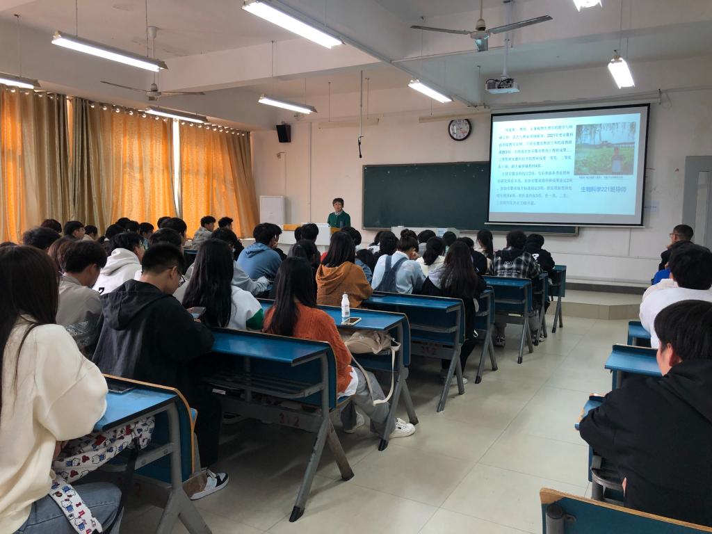会上,刘爱荣围绕生物科学专业概况作出具体讲述,向同学们介绍了什么叫生物科学、生物科学的学科以及学习生物科学专业的作用,让同学们对生物科学专业有了更深层次的了解。她鼓励同学们认真学习、树立目标、合理规划生活与学习;告诉同学们在遇到困难时积极与老师们交流,寻求老师帮助;希望同学们能提出问题、探索问题、解决问题,不断探求知识。何庆元希望同学们在大学成长过程中能够不断探索新知识,学习新能力,一边学习一边成长,在学习之余不忘加强锻炼,提高身体素质。