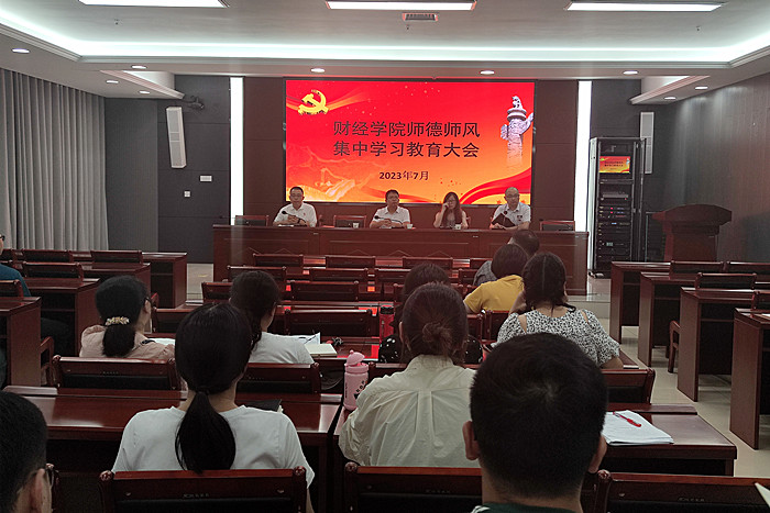 为深入学习习近平总书记关于教师队伍建设的重要指示批示精神,贯彻落实新时代教师职业行为十项准则,强化学院教师的思想政治素质和职业道德水平,7月4日下午,财经学院在西附楼111召开师德集中学习教育大会。学院党政领导出席,全体教职工参会。