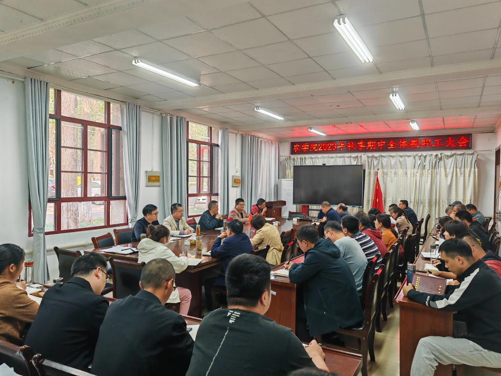 10月25日下午,农学院在学院会议室召开2023年秋季期中全体教职工大会,学院党政领导和全体教职工参加会议。会议由农学院党委副书记、院长崔广荣主持。