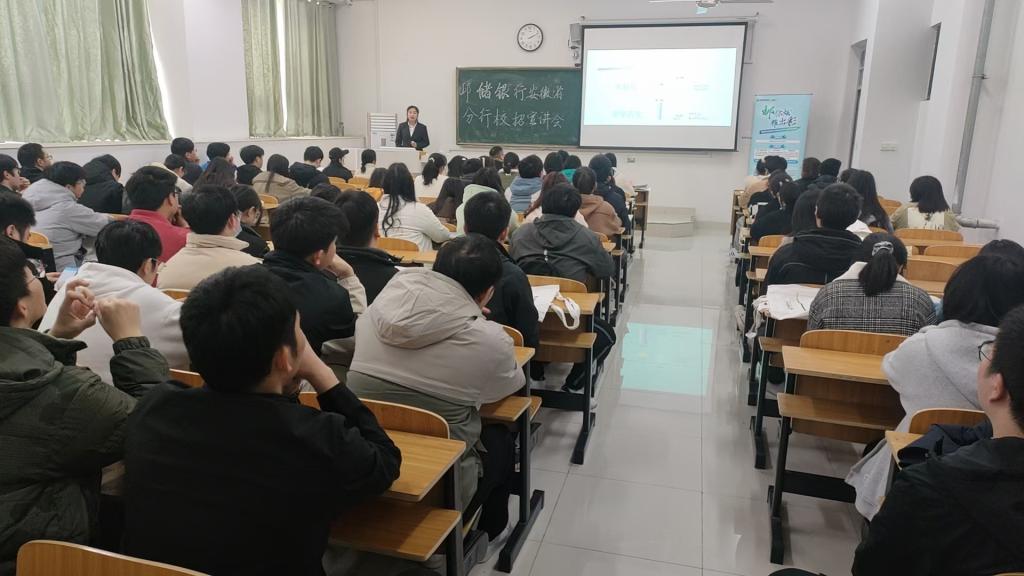 为贯彻落实全国高校2023届毕业生就业工作第二次视频调度会议精神和教育部“春季促就业攻坚行动”部署及学校就业推进会要求,3月23日下午,财经学院邀请中国邮政储蓄银行安徽省分行来校举办春季校园专场招聘宣讲会。中国邮政储蓄银行宿州市分行、淮北市分行、蚌埠市分行招聘工作负责人,学院2015届优秀毕业生代表、现任宿州市分行公司金融部副总经理聂佑东出席会议。财经学院2023届毕业生及龙湖校区其他对口专业毕业生100余人参加宣讲会。
