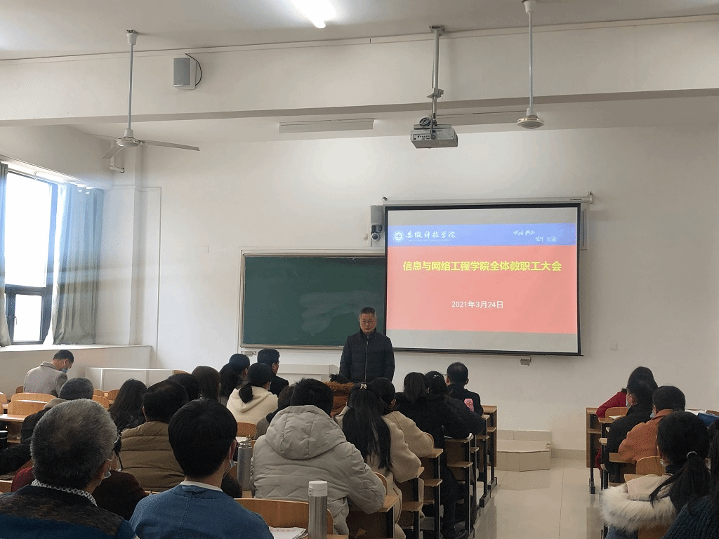 为进一步提高对哲学社会科学工作重要性的认识,落实巡视整改任务。3月24日下午,信息与网络工程学院召开全体教职工大会深入学习习近平总书记在哲学社会科学工作座谈会上的重要讲话精神,强调做好“一会一报”制度的落实工作。学院党委书记王振其、正处级组织员周向群,党委副书记韦乃学、副院长何恩节、副院长曹浩及全体教职工参加会议,会议由王振其主持。