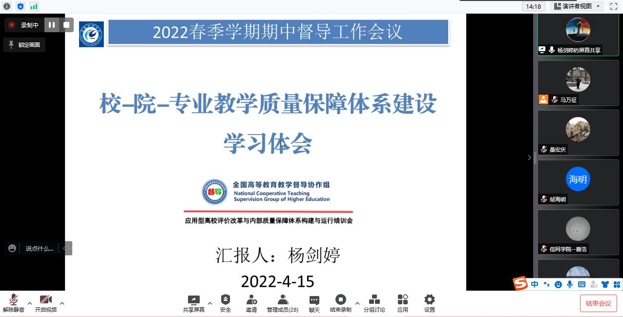 为加强教学质量监控工作,促进教师教学水平提升,保障线上线下教学工作规范开展,4月15日下午,学校召开2022年春季学期期中教学督导工作会议。全体校教学督导员、院级督导组组长及督导考核办公室成员参加了会议,会议由督导考核办公室主任程斌主持。