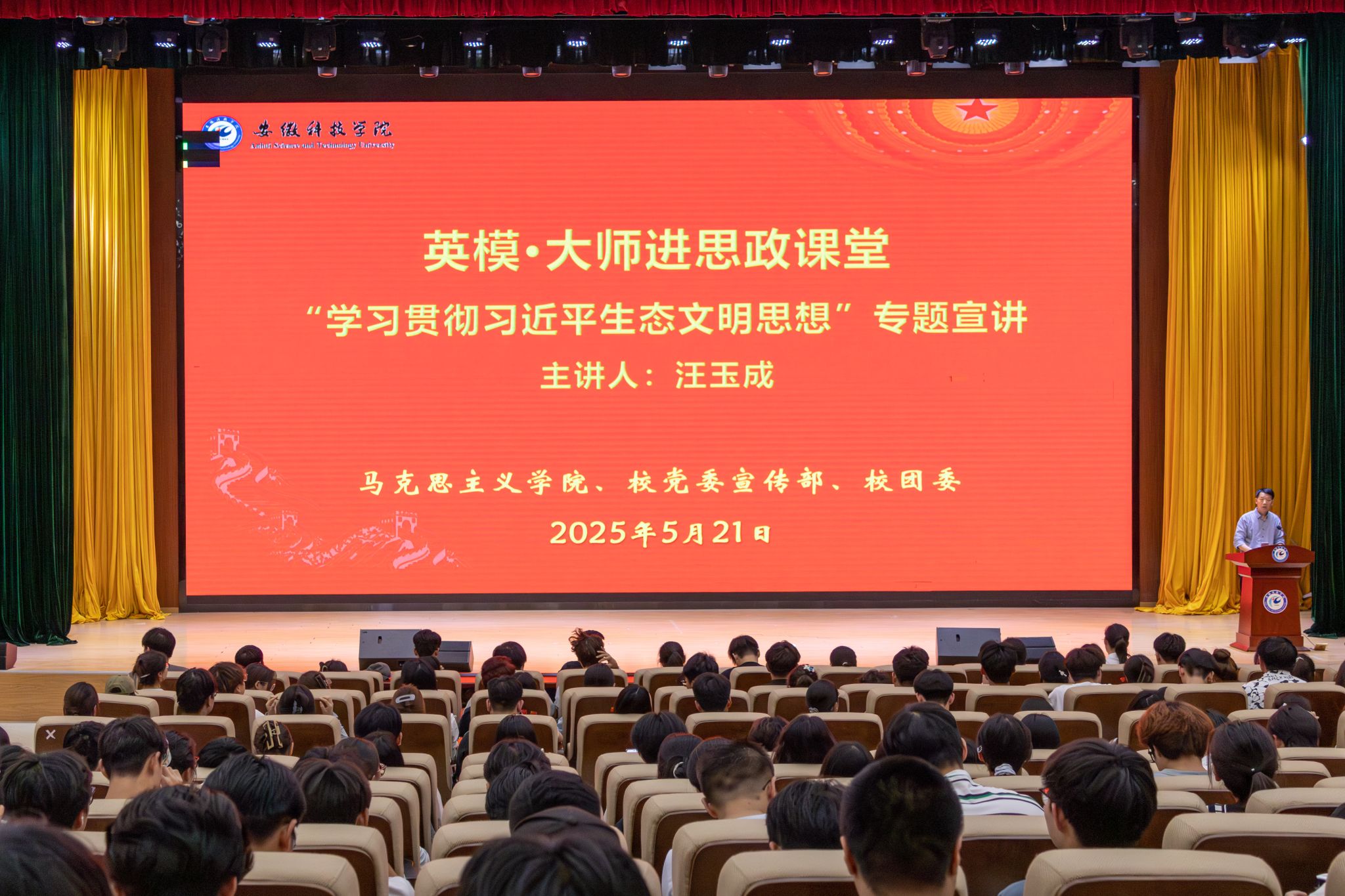 5月21日下午,马克思主义学院、党委宣传部和校团委联合举办的新时代先进人物进校园“英模・大师”进思政课堂报告会在龙湖校区东辅楼报告厅举行。400余名师生现场聆听报告,报告会由马克思主义学院院长张德化主持。