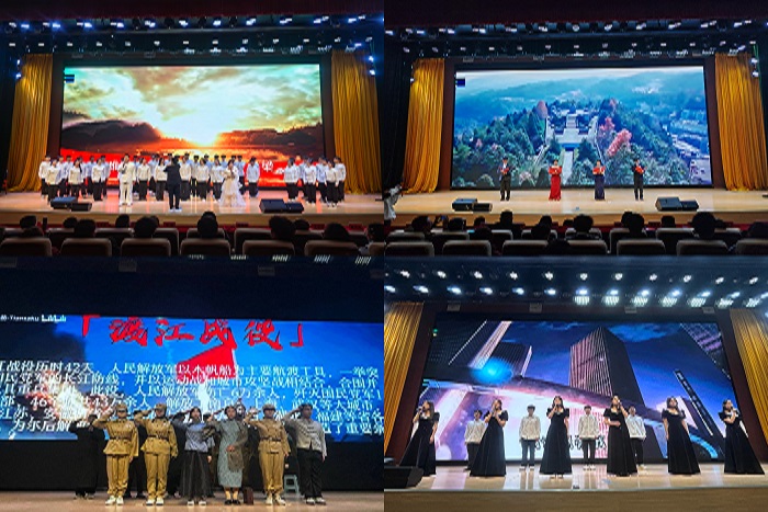 第二篇章《电燃梦想,青春飞扬》,开场舞《MONSTERS》《Diamond》引燃全场,为新生的大学生活璀璨开篇;舞蹈《文明大作战》以幽默诙谐的表演方式展现了大学校园中的点滴趣事;歌曲《罗生门》《夜空中最亮的星》、舞蹈《We Rock》等节目诠释了青春的朝气与活力,展现了多元包容、活力四射的校园文化氛围。第三篇章《铭记历史,吾辈自强》,汉服走秀《霓裳风华》、光影戏《与妻书》、歌曲《拆穿》和话剧《永不消逝的电波》等节目情感真挚的表演,激励学生牢记历史,自立自强。第四篇章《盛世中华,共创辉煌》以“筑梦”为核心,教师朗诵《共筑中华复兴梦》、表演《强国有我》引导全体新生在崭新的起点接续奋斗,扬帆起航,激励他们不忘初心,砥砺前行,为实现中华民族伟大复兴的中国梦而奋斗。