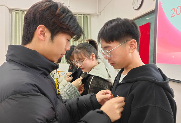 学院团委委员、辅导员尹成超宣读了2024年新发展团员名单,并由团委委员们为新团员佩戴上团徽。在学院团委委员、辅导员丁雨妍的带领下,新团员们面对团旗庄严宣誓,铿锵有力的誓言表达了他们对团组织的忠诚和对未来使命的坚定信心。随后,新团员代表黄景作了表态发言,表示将时刻牢记团员身份,继续发扬共青团的优良传统,更加严格地要求自己,努力学习,积极进取,用青春的激情与汗水,肩负起伟大新征程上的青春使命。
