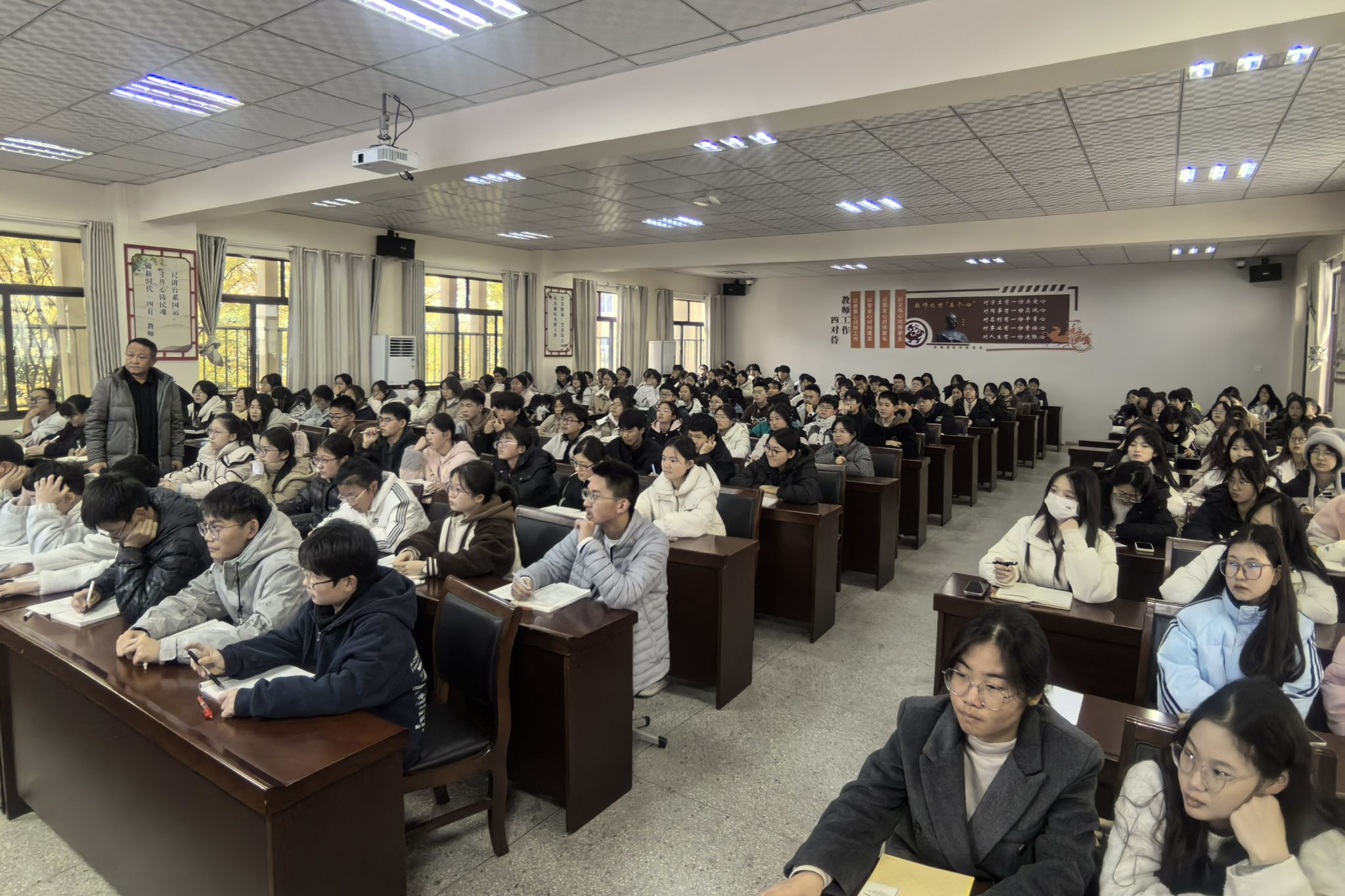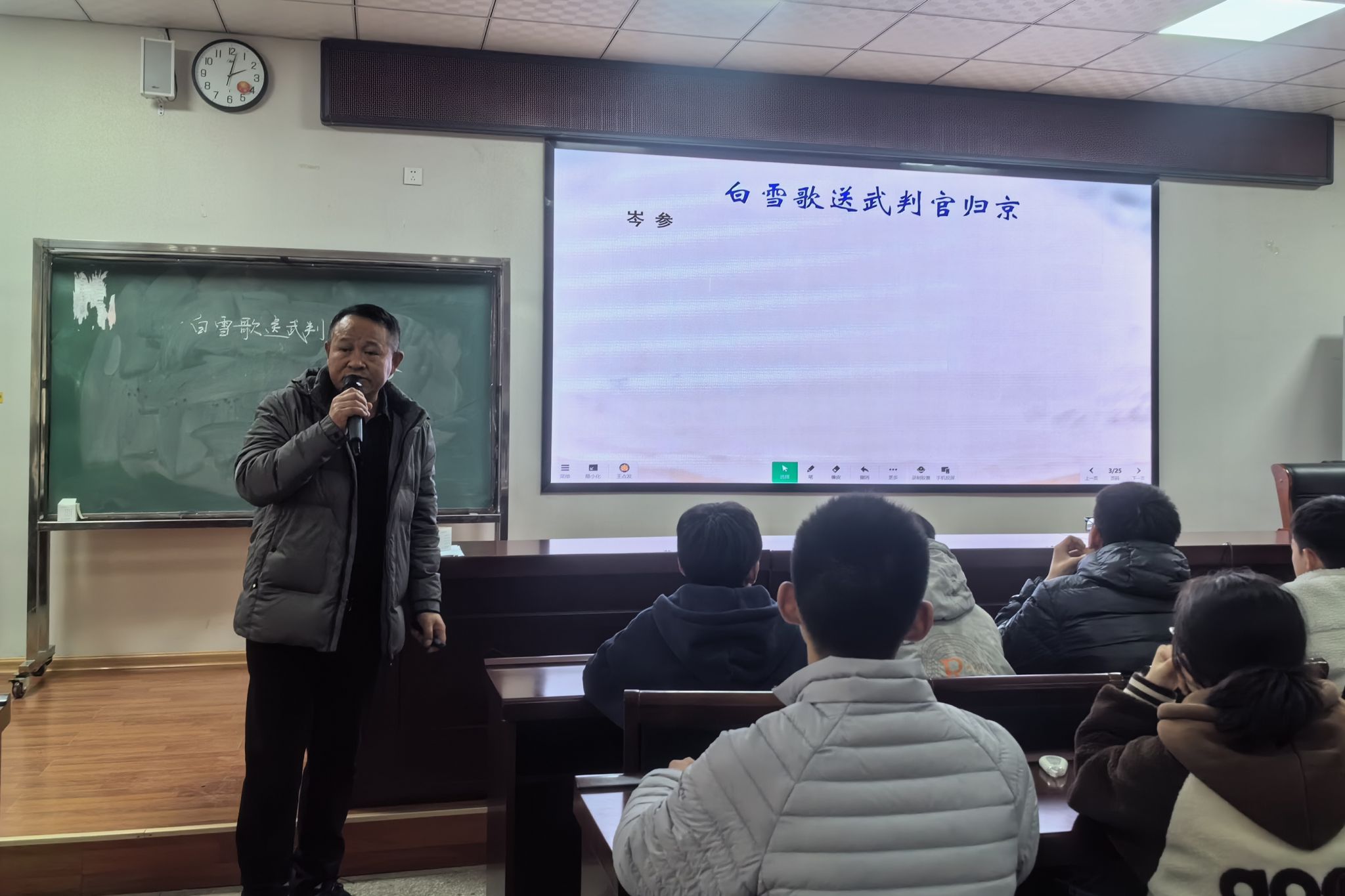 见习过程中,2024级汉语言文学专业的同学主要观摩了凤阳实验中学高级教师王占发的公开课——《白雪歌送武判官归京》。课堂从“雪”的主题引入,通过经典诗句激发学生的学习兴趣。见习生们从旁观摩,亲身感受到如何通过教学设计吸引学生注意力,巧妙导入课程内容。
