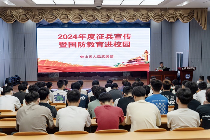 学校邀请蚌埠市蚌山区人武部部长曾鸣来校作征兵宣传暨国防教育报告会,报告会就国家周边安全形势、国际环境以及面临的区域挑战,阐述了国防的重要性,号召同学们响应国家召唤,投身国防建设,积极报名应征入伍,在部队中升华人生,建功立业。报告会还就应征入伍优待政策、发展前景、体格检查等工作进行了详细讲解。报告会有较强的针对性、指导性,感染力强,帮助同学们进一步了解了应征入伍政策,有效激发了同学们携笔从戎、建功军营、报效祖国的激情热情。