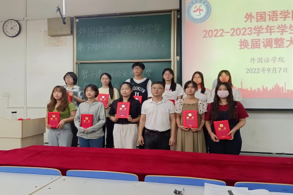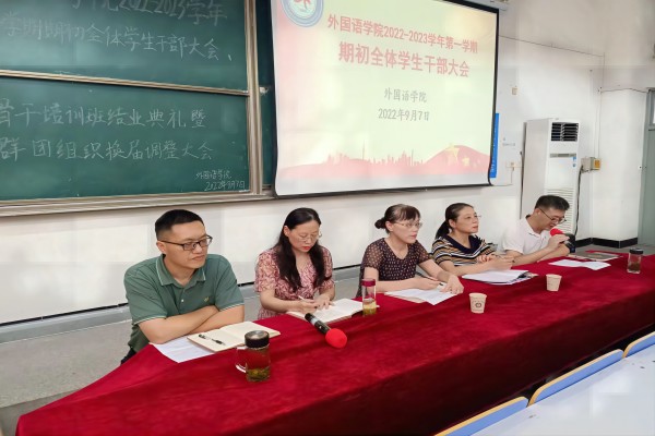 9月7日下午,外国语学院在求知楼A106教室召开2022-2023学年秋季学期期初全体学生干部大会,外国语学院全体党政领导出席会议,全体辅导员、分团委学生委员、学生会、艺体中心、易班工作站主要负责人以及各班级班长、团支部书记、学习委员参加会议。会议由学院党委副书记张海亮主持。