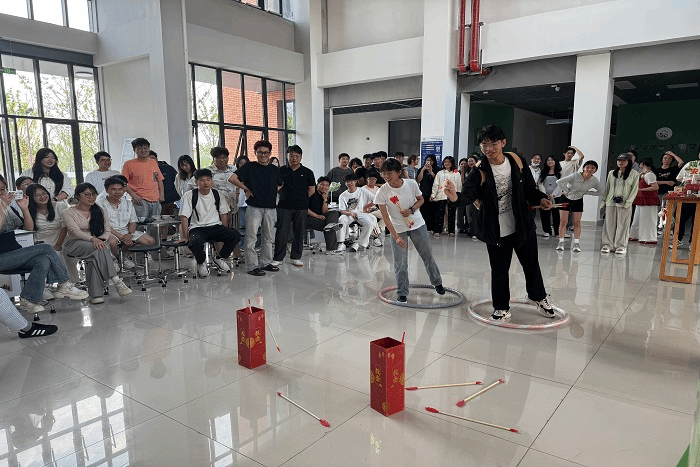 为了让同学们沉浸式体验端午民俗,活动特别设置了“民俗游戏闯关”,同学们手持箭矢,凝神屏息,瞄准前方的壶口,或精准投入赢得满堂彩,或擦边而过引来善意的欢笑,体验了一把古代士大夫的雅趣。别开生面的“旱地龙舟”比赛将活动推向高潮。同学们夹着气球构成龙舟,喊着整齐划一的口号,依靠团队默契奋力“划动”龙舟向终点冲刺。加油声、呐喊声、欢笑声汇成一片,充分展现了团队协作的力量和力争上游的拼搏精神。