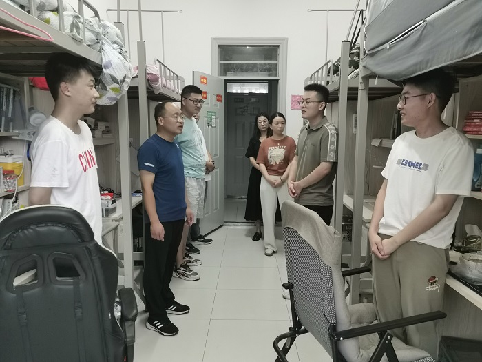 会后,尚磊与辅导员一行深入留校学生宿舍,实地查看了宿舍卫生状况及安全管理规定的落实情况,详细询问学生公寓洗浴、食堂餐饮、图书馆自习等生活学习方面是否存在困难,并提出三点要求:一要珍惜和利用好在校时间,在考研复习、科研实验、社会实践等事项中,更加积极地与老师联系,寻求有效帮助,促进目标达成。二要树立安全意识,要遵守校规校纪,注意人身财产、宿舍、出行安全,提高防诈意识,做好自己的安全守护员。三要劳逸结合,注重全面发展。要合理分配时间,在潜心学业的同时,加强体育锻炼,养成健康的生活习惯。以积极进取的状态, 平和淡然的心态度过一个安全愉悦,收获满满的暑期。一句句真情关切的询问和叮咛,传递着对暑期留校学生的关怀和厚爱。
