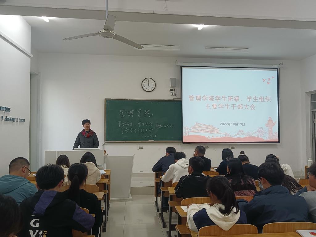 为进一步强化学生干部队伍和班团组织建设。10月19日下午,管理学院在致知楼B208教室召开学生班级、学生组织主要学生干部大会,党委副书记陶漫出席会议并讲话,党政办主任李永鹏,辅导员江旭聪、黄斐、姚姝媛、赵晨妍出席会议,会议由江旭聪主持。