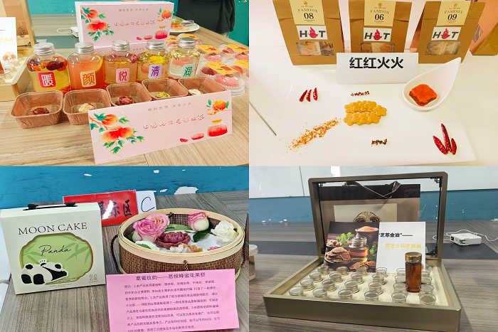 比赛现场,各参赛团队代表借助PPT汇报,通过实物展示等形式,全方位地向评委们呈现了其创意成果。汇报内容聚焦研发背景、原料创新、工艺流程、市场前景等维度展开,评委们也对产品进行了全面专业的评价与打分,为各团队的后续改进明确了方向。产品展示区域,“葛蜜玫韵——葛根蜂蜜花果糕”“芝萃金油——灵芝三萜芝油”“金玉良‘圆’——全谷物无麸质玉米汤圆”“红红火火”“康养司康”等特色产品依次摆放在展台上,各类产品包装独具匠心,吸引了校内众多同学前来观摩,现场人头攒动,气氛热烈,大家都对此次活动表现出了浓厚的兴趣。