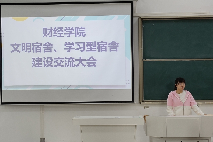 辅导员丁雨妍介绍了学校文明宿舍创建标准及评比方法、学习型宿舍评选条件。院自律委员会副部长戴程、刘文倩分别讲解学院查寝办法与《财经学院学生文明宿舍公约》。连续两次次获评校学习型宿舍、文明宿舍的寝室长代表张玉婷从寝室公约、学习目标、值日制度、人际交往等方面分享了学习型宿舍、文明宿舍创建的具体做法和经验。