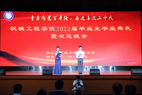 昔来兮,桃李累累;今往兮,杨柳依依。2022年6月14日晚,机械工程学院党委在大学生活动中心隆重举办“机械工程学院2022届毕业生毕业典礼暨欢送晚会”。学院党委书记、院长陈丰,正处级组织员张严政,党委副书记、纪委书记张程,副院长张华、乔印虎,副处级辅导员开金苗,教学秘书苑风霞,党政办公室副主任王飞,机械设计制造工程系主任缑瑞宾,汽车工程系主任刘春辉,各系副主任、党支部书记,2022届毕业生学业导师,全体辅导员,全体在校毕业生及部分非毕业班同学代表参加。机械工程学院2022届毕业生毕业典礼和欢送晚会分三个阶段进行,依次为毕业典礼、2022级省级优秀毕业生颁奖仪式、毕业生欢送晚会,毕业典礼和颁奖仪式由张程主持。