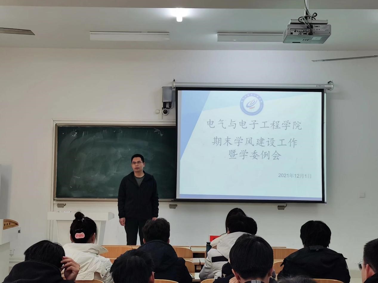 为提升学院的学习氛围,进一步促进学风建设,2021年12月1日,电气与电子工程学院在致知楼C205召开期末学风建设工作暨学委例会。学院党委副书记尚磊、辅导员陈更强及19级、20级、21级学委参加了会议。