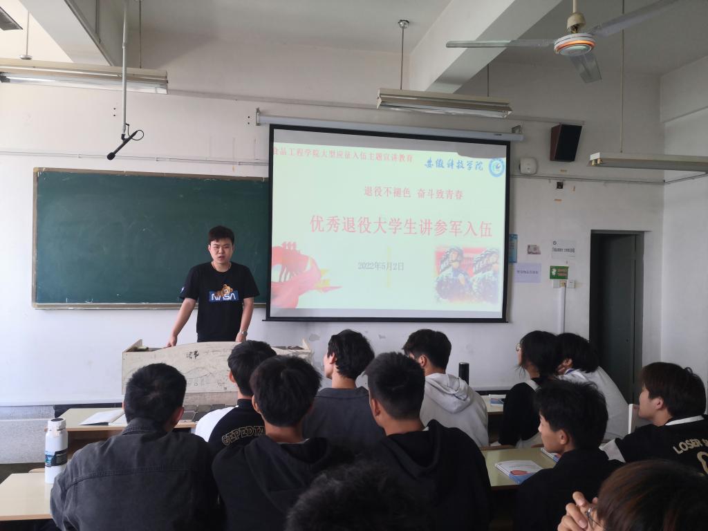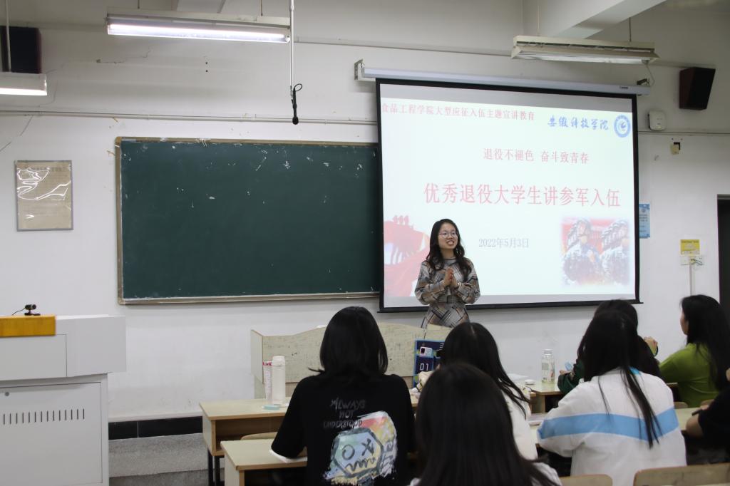 为进一步增强大学生应征入伍意识,激发参军报国情怀,推进学院征兵工作。5月3日,食品工程学院分专业举办了“退役不褪色,奋斗致青春”优秀退役大学生士兵讲参军入伍主题教育宣讲活动。学院各辅导员主持了宣讲活动。