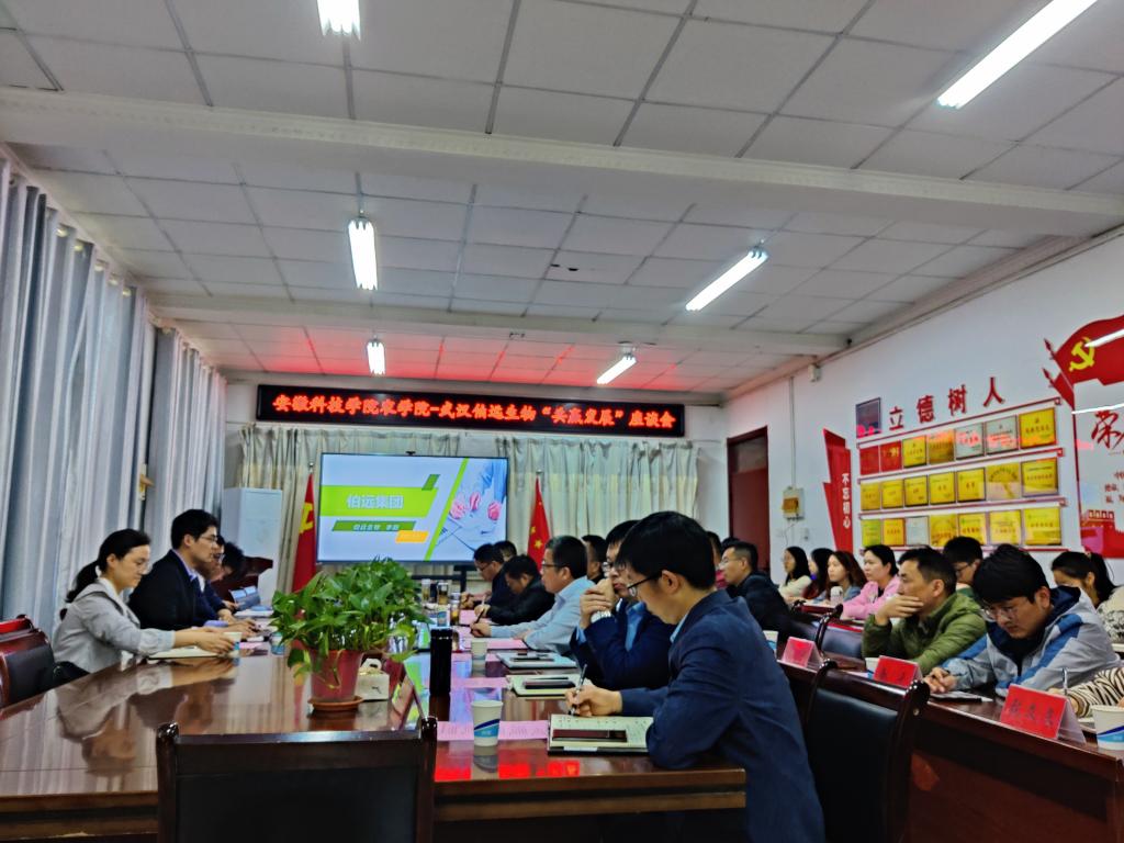 为深入推进校企产学研合作,联手开展人才培养与聘用,应农学院邀请,武汉伯远生物科技有限公司总经理李阳博士、营销总监金杰博士等一行4人回访农学院。5月9日上午,农学院在学院会议室成功举办“安徽科技学院农学院-武汉伯远生物‘共赢发展’座谈会”。农学院党政班子全体成员,资源与环境学院党委副书记沈树周,校学术委员会黄先忠教授以及来自动物科学学院、生命与健康科学学院、资源与环境学院及农学院15位博士及近二十名研究生出席座谈会。座谈会由农学院党委书记何世潮主持。