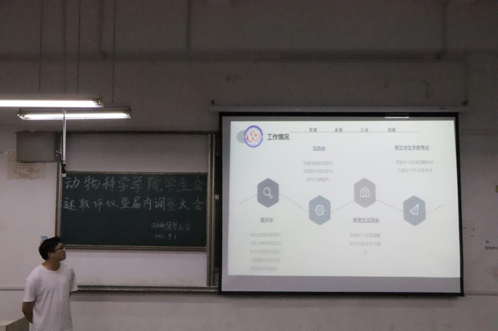 为推进动物科学学院学生会组织依法依章开展工作,加强学生会组织建设,9月1日下午,动物科学学院于求知楼A106教室召开学生会干部述职评议暨内部调整大会。学院党委副书记汤帅,院党政办主任、团委书记李焱,学生会指导老师胡文丽,校学生会主席团成员刘名,18、19、20级学生代表出席此次会议。上一任学生会干部和现任学生会全体成员参加会议。会议由李子燕主持。