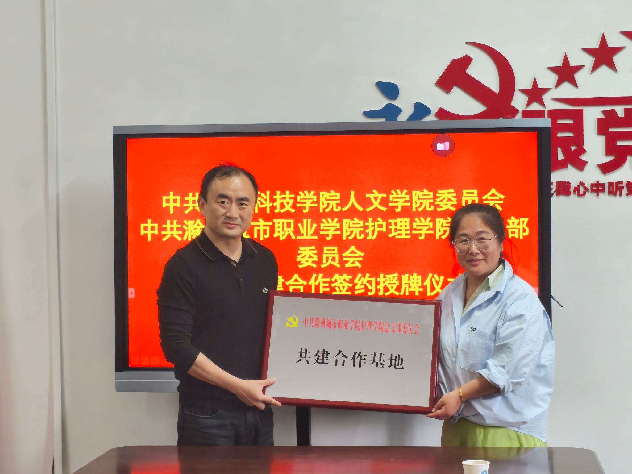 4月25日下午,人文学院党委书记、院长李晓东一行4人赴滁州城市职业学院护理学院,参加党建共建合作签约授牌仪式。仪式由滁州城市职业学院护理学院教工党支部书记、副院长李勋华主持,双方围绕党建共建目标推进合作事宜。