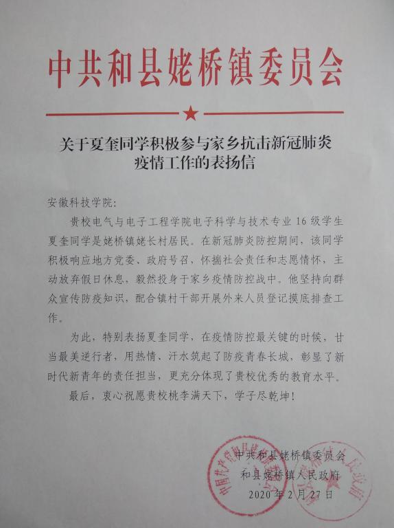 谈到夏奎,村支书夏发平兴奋地说:虽说自己平时走街窜巷,但这段时间工作量也有点让吃不消,没想到夏奎却没说苦与累,从夏奎身上看到了成长起来的年轻人身上的一种责任担当。2月27日,中共和县姥桥镇委员会致函安徽科技学院表扬夏奎在疫情防控关键的时候,甘当最美逆行者。