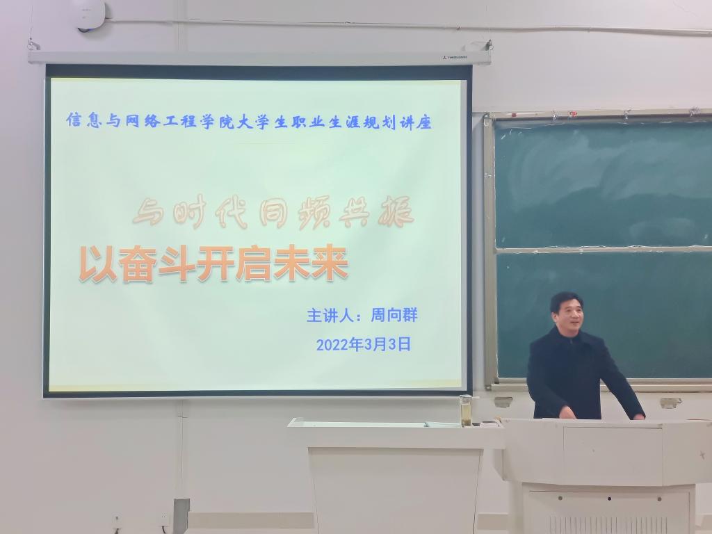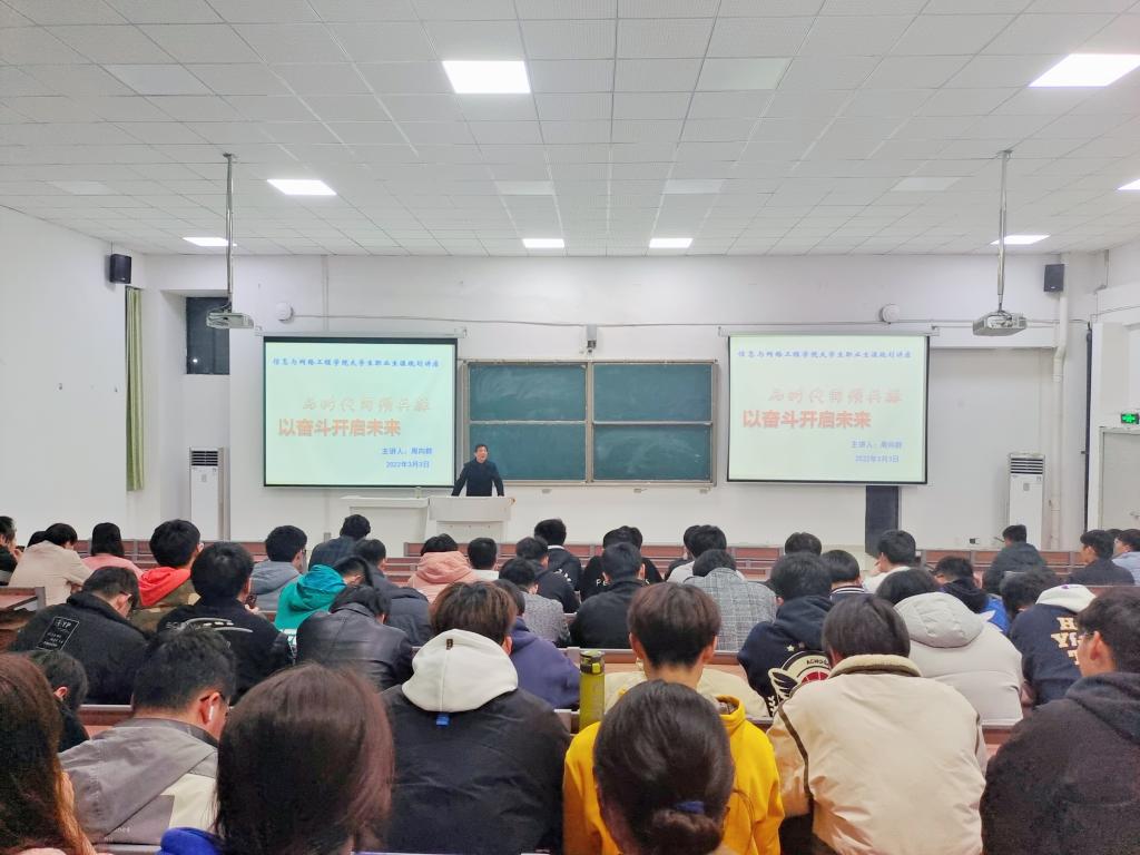 为贯彻落实习近平总书记在党史学习教育动员大会上的重要讲话精神,更好地帮助同学们认清当前形势,做好职业生涯规划,在顺利完成学业、按期毕业的基础上,为实现下一个目标提供借鉴和参考。3月3日晚,信息与网络工程学院在致知楼C111开展大学生职业生涯规划讲座活动。本次讲座由正处级组织员周向群主讲,21级计算机科学与技术(专升本)班全体学生参加。