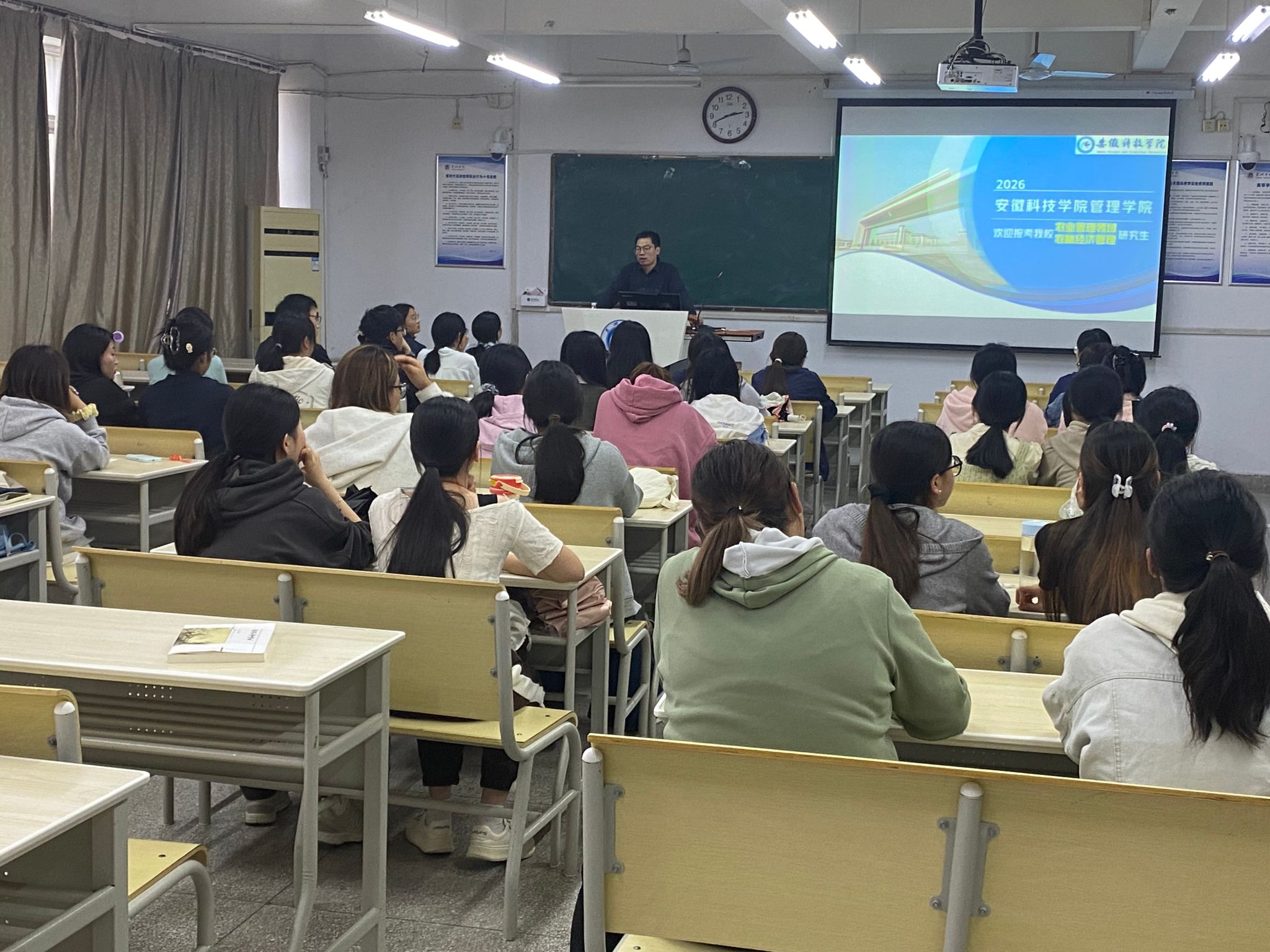 宣讲会上,丁景良一行与同学们进行了面对面交流,系统介绍了学校及学院的办学特色、研究生培养优势、招生政策、奖助体系以及报考注意事项,重点讲解了学院依托“数字乡村建设与治理”安徽省哲学社会科学重点实验室,围绕区域新兴产业发展需求构建的人才培养体系。宣讲组还全面展示了学院的师资力量、科研与实践平台、奖助政策,明确了农业管理专业硕士与农林经济管理学术硕士的考试科目、参考书目及近年复试分数线,并介绍了学校各校区的区位条件、教学与生活设施,以及管理学院的专业发展前景与就业优势。