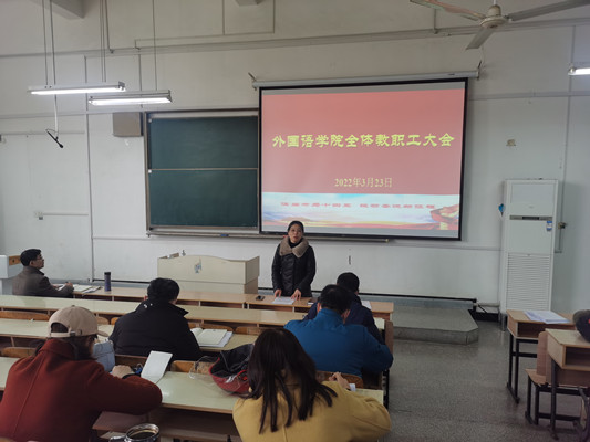 3月23日下午,外国语学院在求知楼A202教室举行全体教职工大会,部署新冠肺炎疫情防控工作、推进学院年度重点工作。学院领导班子及全体教职工参加会议,会议采用线下和线上同步模式,因居家隔离等原因无法到场的教职工在线上参加会议。会议由学院院长陈德用主持。