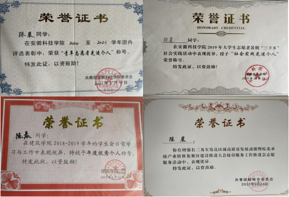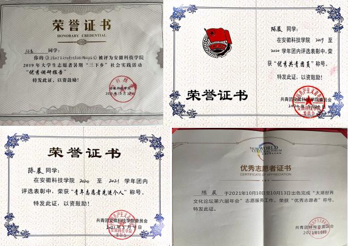 在刚进入安徽科技学院时,陈晨也曾经迷茫过自己的未来,但在和学长、老师交谈后,陈晨逐渐明确了自己大学期间的目标与方向——尽可能地在大学期间丰富自己的阅历、提高自己的眼界以更好的适应未来。陈晨同学清楚地认识到大学与高中的不同之处,他说道:“高中就只是学习,而大学则是学习加生活,因为大学就相当于进入社会前的一个铺垫,所以大学期间对于综合能力的要求是远高于高中的。”也正是因为有着这样清醒的认识与坚定的信念,他快速适应了大学生活,并在学习,工作等方面获得了非凡的成就。