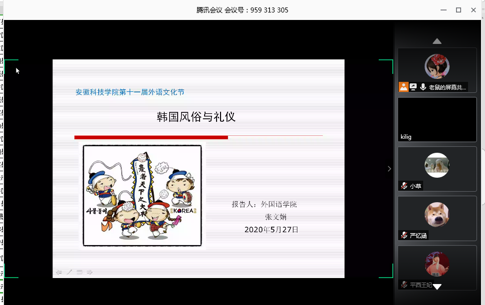 为丰富学生校园文化生活,拓宽学生对外国民族风情的了解和认识,外国语学院于5月27日下午,利用腾讯会议在线举办了“英博杯”安徽科技学院第十一届外语文化节之韩国风情讲座。本次讲座特邀外国语学院张文娟老师担任主讲人,外国语学院党总支书记蔡为青,专职辅导员宋兵兵出席,学院18、19级约200余学生共同参加,此次讲座由宋兵兵主持。