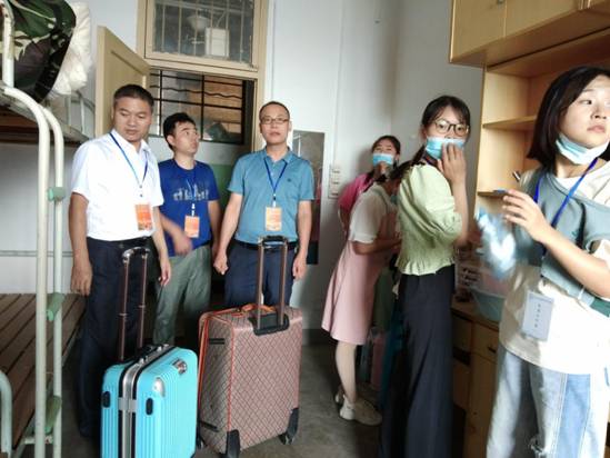 学院老师也加入迎新队伍,在报道现场帮助新生解决困难,同时亲力亲为帮新生搬运行李,与新生进行友好的交谈。