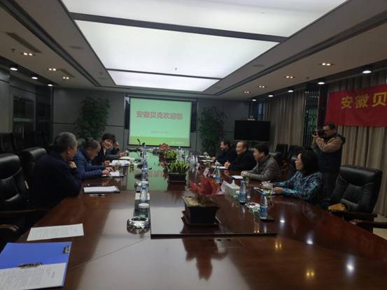 在会议大厅,贝克集团副总经理蔡薇女士、集团副总经理柏俊教授、总裁助理陈小峰博士、贝克生物总经理郭立新对金光明院长一行的到来表示热烈的欢迎。座谈中,蔡薇简明扼要地介绍了贝克集团公司的发展历程、主要产品和发展规划,金光明详细介绍了安徽科技学院的办学历史、生命与健康科学学院和生物医药与健康研究院教学科研的基本情况,双方代表就校企合作、人才培养、产学研合作等问题进行了深入交流。